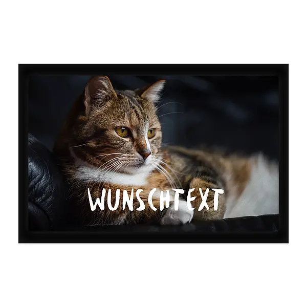 Fußmatte mit eigenem Katzenmotiv und Wunschtext mit Ihrem Wunschfoto personalisiert optional mit Wunschtext Maße: 60 x 40 cm Oberflächenmaterial: Filz schwarze Schaumgummi-Rückseite, rutschhemmend waschbar Das Foto sollte idealerweise eine Auflösung von 300 dpi oder mehr haben. Bitte achten Sie auch auf das Bildformat. Wenn man zb. ein Hochkantbild auf eine querformatige Fußmatte drucken lässt, kann nur ein entsprechend passender Bildausschnitt für den Druck gewählt werden. Ebenfalls ist es wichtig, dass das Motiv nicht zu knapp beschnitten wird. Beim Druckvorgang gehen ein paar cm Rand vom Foto verloren. Fußmatten mit Katzenfotos sind eine beliebte Wahl für Katzenliebhaber und Tierfreunde. Diese Fußmatten sind nicht nur funktional, sondern auch eine süße und charmante Möglichkeit, Ihren Eingangsbereich zu verschönern. Das Katzenfoto auf der Fußmatte verleiht Ihrem Zuhause eine persönliche Note und zeigt Ihre Liebe zu diesen niedlichen Vierbeinern. Also warum nicht Ihre Gäste mit einer Fußmatte mit Katzenfoto begrüßen und gleichzeitig Ihren Eingangsbereich aufwerten? Neben ihrer ästhetischen Wirkung erfüllt die Fußmatte natürlich auch ihren eigentlichen Zweck: Sie hält Schmutz und Feuchtigkeit draußen. Egal, ob Sie gerade von einem Spaziergang mit deinem pelzigen Freund zurückkehren oder einfach nur Ihre Schuhe abtreten möchten, die Matte ist der perfekte Ort, um Schmutz und Nässe loszuwerden. Waschbare Fußmatten sind eine praktische und hygienische Lösung für den Eingangsbereich oder andere stark frequentierte Bereiche in einem Zuhause oder einem Geschäft. Sie bieten nicht nur Schutz vor Schmutz und Feuchtigkeit, sondern können auch leicht gereinigt werden, um ihre Funktionalität und Ästhetik aufrechtzuerhalten.